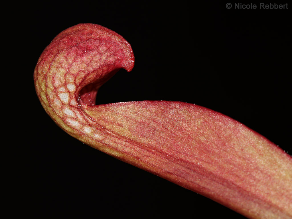 Zusammen mit der Sarracenia Hybride kaufte ich diese Pflanze in einem Supermarkt zum Schleuderpreis. Sie war auch komplett grün. Im Winter starben dann die Schläuche ab und im Frühjahr bildete sich zu meinem großen Erstaunen eine Blüte aus und im Sommer färbte sie sich dann endlich auf dem Balkon schön rot aus.